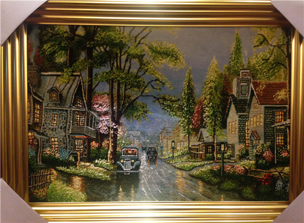 Introductions: The street is quiet and peaceful, and it seems more clean and tidy after the rain. The picture is still gorgeous although rained. It’s realistic, rigorous composition and has perfect proportion. The author use gold wire to give leaves’ life and the leaves are sparkling from a distance. This works indicates that after a storm comes a calm.